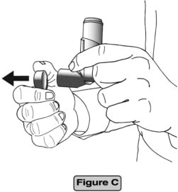 - Hold the actuator upright. Spray 3 times into the air away from the face, by pressing down fully onto the center of the dose indicator button. (See Figure B)