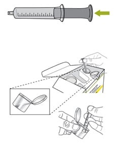 - Once mixed, measure the prescribed dose with notched tip syringe provided with the kit. Only use the notched tip syringes that come with the kit to prepare and administer the medicine.