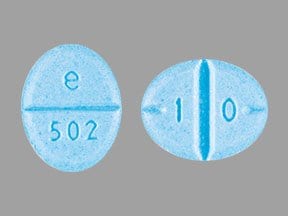 This blue elliptical / oval pill with imprint e 502 1 0 on it has been identified as: Amphetamine/dextroamphetamine 10 mg.
