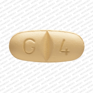 This yellow elliptical / oval pill with imprint G 4 on it has been identified as: Oxcarbazepine 300 mg.