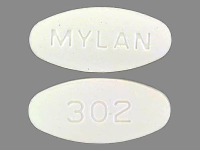 This white elliptical / oval pill with imprint MYLAN 302 on it has been identified as: Acyclovir 800 mg.