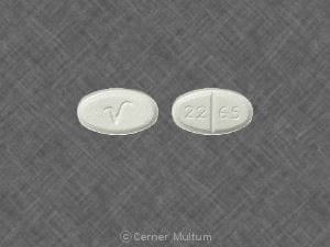 This white elliptical / oval pill with imprint V 22 65 on it has been identified as: Baclofen 10 mg.